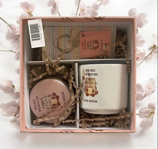 motive edici bir mesajla tasarlanmış kaliteli seramik kupa, sıcak bir atmosfer yaratacak hoş kokulu mum ve her zaman yanınızda taşıyabileceğiniz şirin bir anahtarlık bulunuyor.